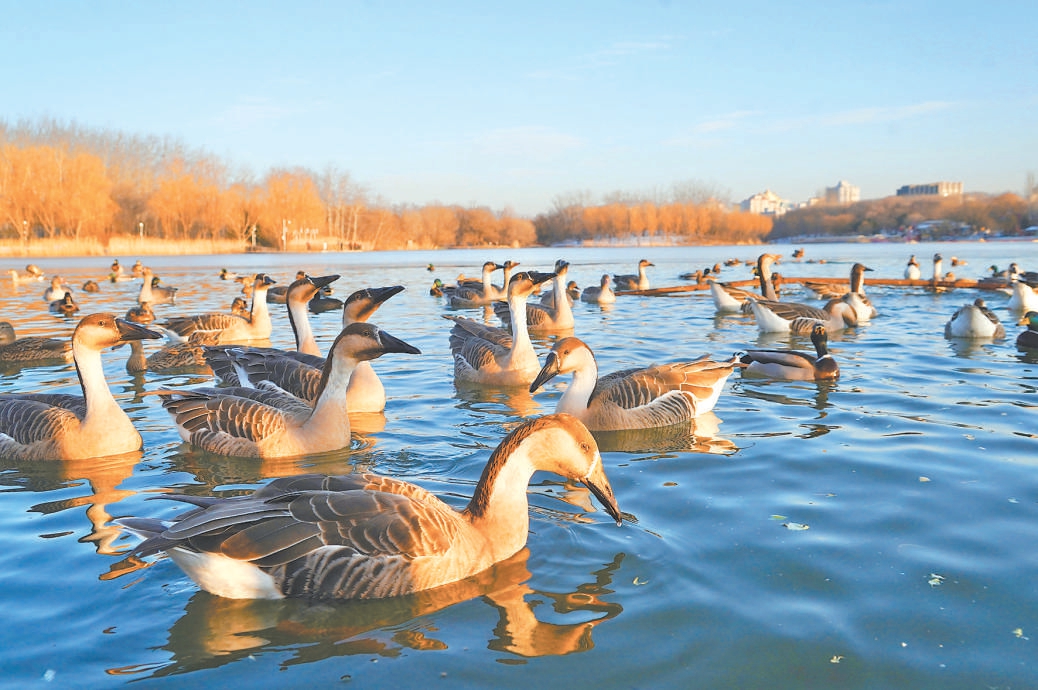 候鸟流连,为冬天的京城带来了生动的景致。昨天,记者在奥森公园看到,奥海上结了薄薄一层冰,鸿雁、黑水鸡、骨顶鸡正站在冰面上晒太阳。今年高峰时,奥海的候鸟有三四百只,眼下虽然飞走了不少,但也停留了一些,并没有往年同期的寂寥。