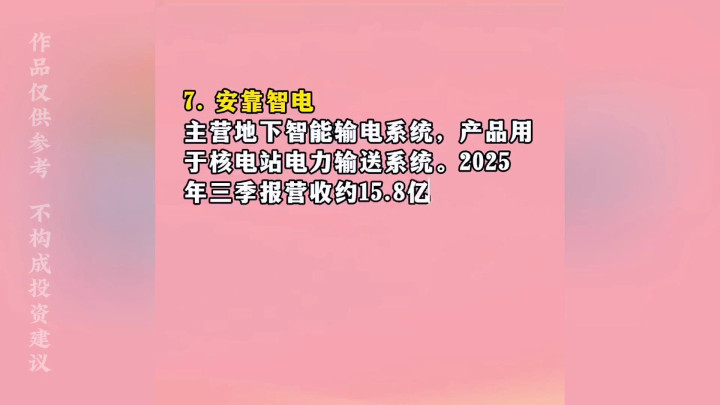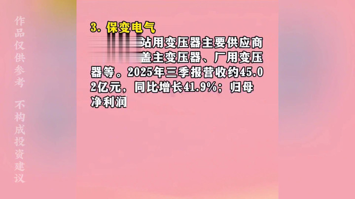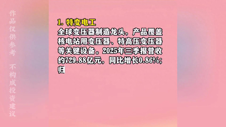 ·7.三变科技:主营变压器产品,用于核电站配电系统。2025年三季报营收约12.39亿元,同比增长16.91%;归母净利润约4015.5万元,同比增长12.5%。毛利率约17.45%,净利润率约3.24%。自研多款变压器拥64项专利,产品覆盖国网、光伏等场景。