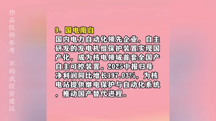 ·8.国电南自:国内电力自动化领先企业,自主研发的发电机组保护装置实现国产化,成为核电领域首套全国产自主可控装置。2025中报归母净利润同比增长197.03%,为核电站提供继电保护与自动化系统,推动国产替代进程。
