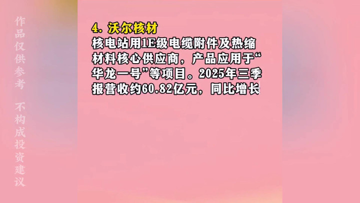 ·4.沃尔核材:核电站用1E级电缆附件及热缩材料核心供应商环球策路,产品应用于"华龙一号"等项目。2025年三季报营收约60.82亿元,同比增长26.17%;归母净利润约8.22亿元,同比增长25.45%。毛利率稳定在30%以上,净利率约14.52%。在核电领域技术壁垒高,认证周期长,建立先发优势和市场地位。
